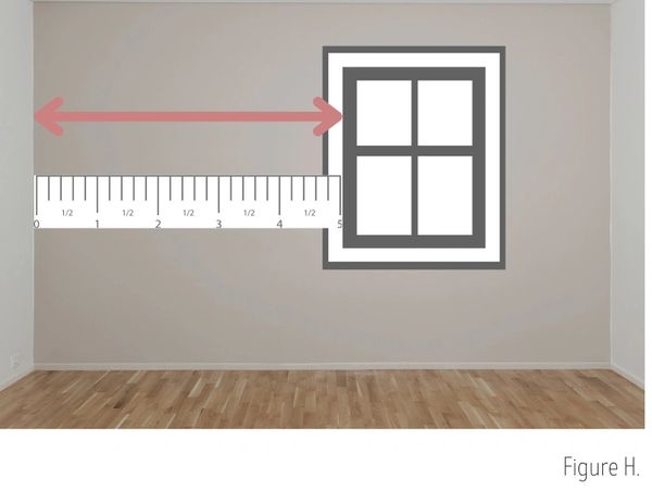 To measure the distance between a wall and a window (Figure H.), for example, measure from the wall edge (not the baseboard edge) to the window opening (not to the window trim).